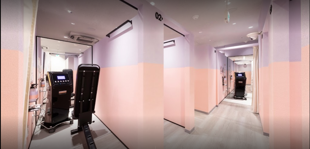 新宿店。高層ビルが多く立ち並ぶオフィス街に位置しています。部屋数は21部屋もあり個室を完備。無料体験も行っており、説明こみで90分とたっぷり使用感を確認できます。